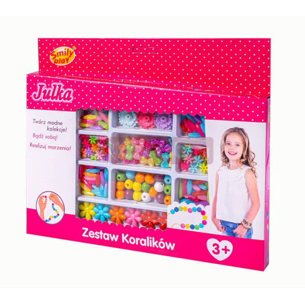 Zestaw kolorowych koralików, dzięki któremu mała dziewczynka samodzielnie będzie mogła zaplanować, stworzyć i użytkować własną biżuterię. Z koralików powstają łańcuszki, zawieszki, kolczyki, bransoletki, naszyjniki, pierścionki. Spersonalizowana biżuterię, można podarować mamie, babci lub najlepszej przyjaciółce. Takie kreatywne spędzanie czasu sprzyja rozwojowi i wspomaga kreatywne myślenie. Samodzielne wykonywanie biżuterii to świetny pomysł na twórcze spędzenie wolnego czasu, na rozwijanie zdolności manualnych, ćwiczenie zręczności dłoni. To też doskonałe zajęcie rozwijające wyobraźnię i kreatywność.