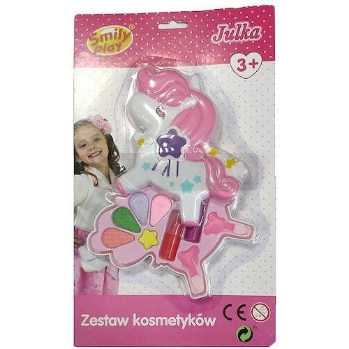 Pierwsze kroki w makijażu z kosmetykami dla małej księzniczki w formie rozkładanego jednorożca. Całości dopełnia czerwona pomadka do ust. Po złożeniu zmieszczą się do torebki małej damy.