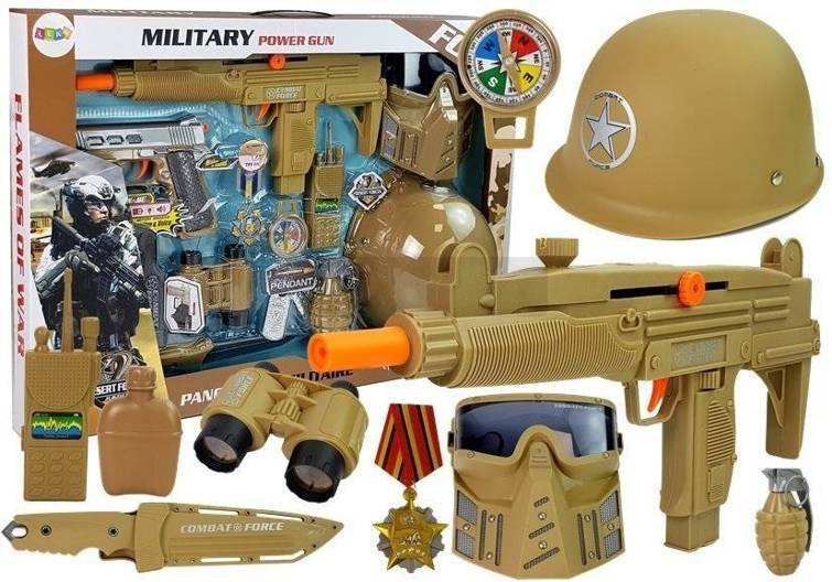 Zestaw Wojskowy Pistolety Broń z Maską Hełmem Granat Dźwięk Militarne zabawki, wojskowe elementy to zazwyczaj figurki żołnierzyków imitujące pole walki lub pistolety na kulki. Filmy akcji inspirują twórców zabawek, cieszą się też one coraz większym zainteresowaniem wśród naszych milusińskich. Powstaje coraz więcej zabawek, które przyciągają swoją funkcjonalnością i różnorodnością. Nasz zestaw zachwyci nie jednego fana gadżetów militarnych i będzie uzupełnieniem stroju podczas balu przebierańców. Całość utrzymana jest w kolorystyce jasnej zieleni. Pistolety wydają dźwięki strzałów jeden za drugim, wystarczy nacisnąć spust, wycelować i pal. W czasie tych czynności można zauważyć efekty świetlne na broni. Żaden złoczyńca nie ucieknie! Akcesoria również umożliwiają zabawę dwójce dzieci - jedno z nich może zostać wyposażone w hełm, lornetkę oraz mały pistolet natomiast drugie z nich może założyć maskę bojową i wyposażyć się w długi gumowy nóż, granat i duży pistolet. Wszystko zależy od wyobraźni malucha. Największą zaletą zestawu wojskowego jest jego rozmiar i liczba elementów. Zestaw dla młodego wojskowego składa się z wielu elementów. Wszystkie wykonane są z wysokogatunkowego tworzywa, co jest gwarancją, że będą służyć dziecku przez długi czas. Elementy zestawu: - pistolet duży - pistolet mały - kabura na pistolet - odznaka - maska - hełm - granat - lornetka - nóż - kompas - nieśmiertelnik - walkie talkie Wymiary wybranych elementów zestawu: - pistolet duży: 37 cm x 16 cm x 3 cm - pistolet mały: 19 cm x 13 cm x 3 cm - maska: 16 cm x 15 cm x 5 cm - hełm: średnica -22,5 cm, głębokość - 10 cm , długość paska- 30 cm - nóż: 25 cm x 5 cm Wymiary pudełka: 61 cm x 41,5 cm x 5,5 cm Pistolet zasilany jest trzema bateriami AG13 1.5V (w zestawie). Zabawki przeznaczone są dla dzieci powyżej 3. roku życia. Zestaw posiada certyfikat CE i jest zgodny z normą EN 71. Zestaw zapakowany jest w kartonowe pudełko, dzięki czemu nadaje się idealnie na prezent.