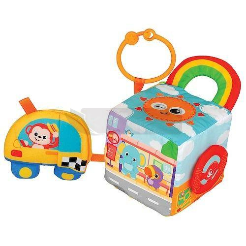 Pluszowa kostka wykonana z kolorowych tkanin o różnych wzorach i fakturach zachęci dziecko do obserwacji, rozpoznawania kształtów, ćwiczenia dłoni i nauki kolorów. W rękach dziecka barwne elementy szeleszczą, dzwonią, grzechoczą, a nawet piszczą. Dedykowana już od pierwszych miesięcy życia niemowlaka.