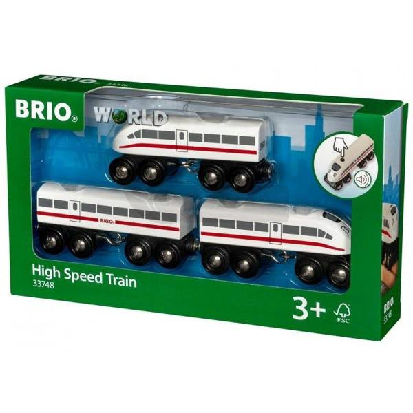 Pociąg ekspresowy 33748. Szybki pociąg na baterię marki Brio to model łączący w sobie funkcjonalność i wygląd tradycyjnego pociągu z zaletami szybkich pojazdów torowych. Zestaw składa się z trzech elementów, mogących łączyć się ze sobą za pomocą magnesu. Naciśnij przycisk na lokomotywie, aby uruchomić sygnały dźwiękowe. Wszystkie tory i dodatkowe elementy Brio dostosowane są do rozbudowywania systemu, kompatybilne są również z drewnianymi torami innych producentów. Dodatkowe elementy pozwolą tworzyć nowe, ciekawe trasy dla pociągów i lokomotyw, aby zabawa ulubionymi kolejkami nie miała końca. Pozostałe zestawy sprzedawane oddzielnie.