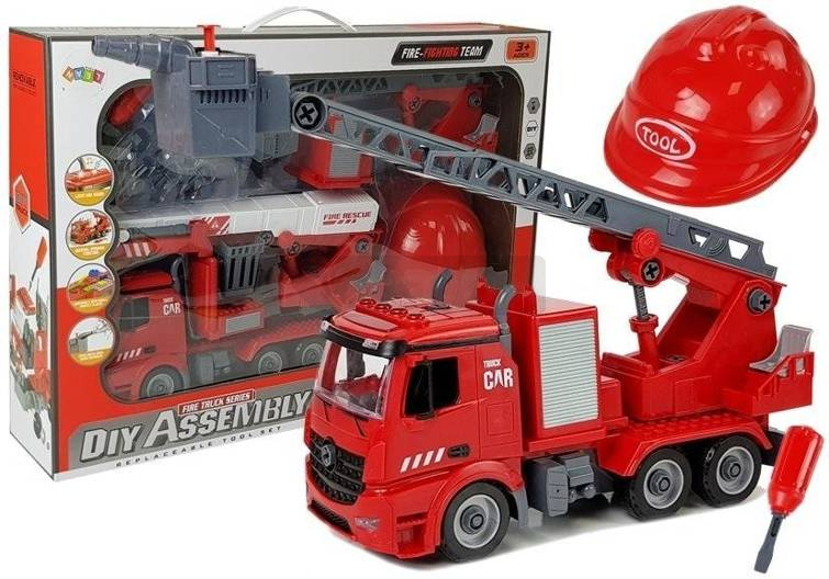 Zestaw DIY Wóz Strażacki 2w1 Wymienne Podnośniki Śrubokręt Dźwięk Efekty Świetlne Kask
