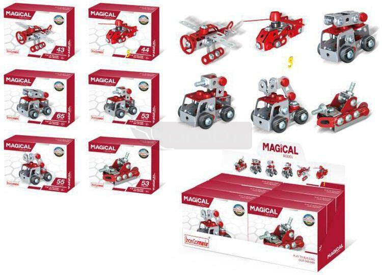 Zestaw metalowych i plastikowych elementów, śrubek i nakrętek, z których można stworzyć pojazdy strażackie.