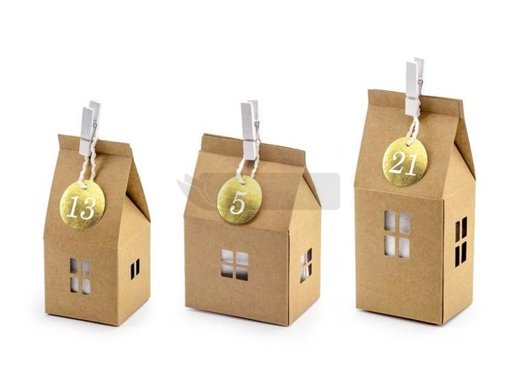 Kalendarz adwentowy Domki, zestaw zawiera: 3 wzory papierowych domków w kolorze kraft, po 8 z każdego wzoru (wymiary: od ok. 5 x 11 x 5 cm do ok. 7 x 11 x 5 cm), 24 drewniane klamerki w kolorze białym (wysokość ok. 3,5 cm), złote papierowe zawieszki z nadrukowanymi białymi cyframi od 1 do 24 (średnica ok. 3 cm), 24 kawałki białego sznurka (długość ok. 20 cm) oraz 24 białe bibułki we wzór złotych kropek (wymiary: ok. 15 x 21 cm). Zestaw do samodzielnego złożenia.