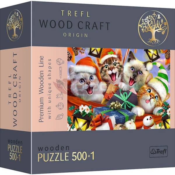 Świąteczne kotki - puzzle drewniane Wood Craft Origin 500+1 elementów to idealny wybór dla wszystkich miłośników układanek. Pozwoli stworzyć obrazek o wymiarach 37,5 x 25,4 cm przedstawiający wesołe kotki w świątecznym klimacie. Układanka została wykonana z drewna, a opakowanie z przyjaznej dla środowiska tektury. Puzzle zawierają nieregularne elementy oraz 50 figurek o tematyce świątecznej.