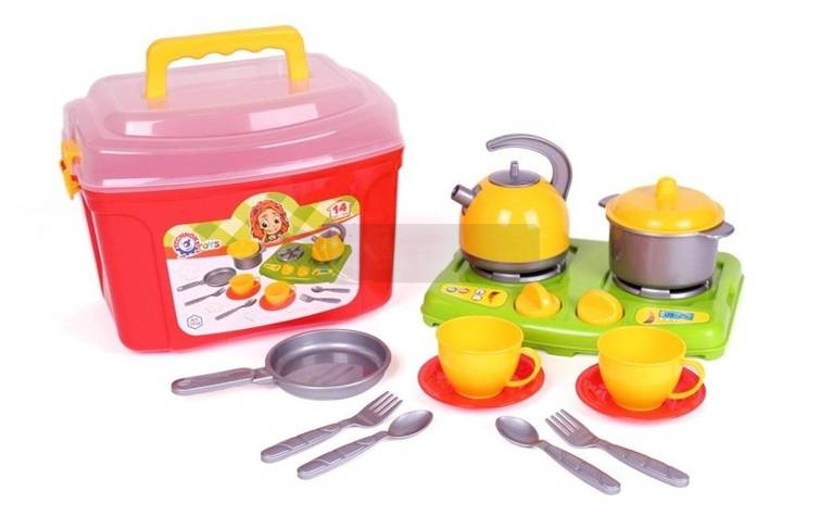 Naczynia składają się w jasnej walizce z przezroczystą pokrywką i wygodnym uchwytem. Jednocześnie walizka jest zabawkową kuchenką gazową. Dziecko będzie mogło ugotować na nim pyszne dania dla zabawkowych przyjaciół i poczęstować ich herbatą. Zestaw naczyń jest jak prawdziwy, więc jest interesujący dla dzieci. Takie gry rozwijają wyobraźnię dzieci, zdolności motoryczne i uczą porządku.