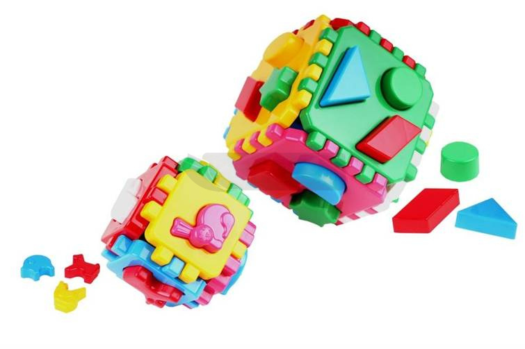 Zestaw dużych i małych kostek z figurami geometrycznymi oraz figurkami zwierząt.