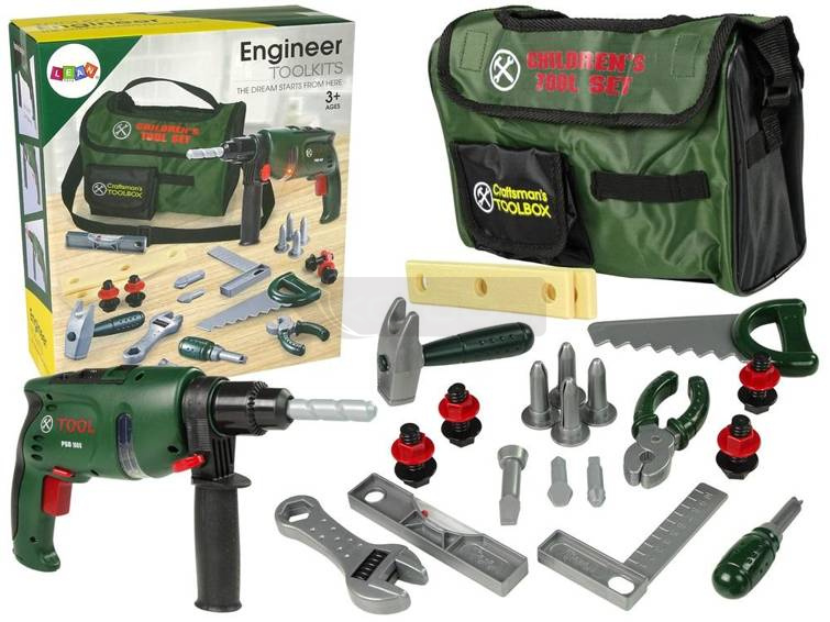 Zestaw Majsterkowicza w Torbie Wiertarka Młotek Piła Klucz Francuski Zestaw do majsterkowania składa się z dużej liczby elementów, co z pewnością sprawi ogromną frajdę każdemu kilkulatkowi. Szansa na zabawę polegająca na naśladowaniu domowej złotej rączki, czyli taty lub dziadka, z pewnością sprawi, że maluch poczuje się odpowiedzialnej. Zabawa z prezentowanym zestawem pozytywnie wpłynie na rozwój dziecka - jego spryt, logiczne myślenie, kreatywność i zdolności manualne. Wielofunkcyjny zestaw narzędzi został wykonany z plastiku, co odpowiada za niską wagę poszczególnych elementów. Stylistyka zabawki nawiązuje do prawdziwych narzędzi, co połączono z prostą, neutralną kolorystyką - dzięki temu dziecko poczuje się jak prawdziwy majsterkowicz. Dużą zaletą zabawek jest dostosowanie ich wymiarów do rączek dzieci, co znacznie ułatwi korzystanie z nich. Torba, w którym znajdują się narzędzia posiada zewnętrzne kieszenie na odpowiednie elementy zestawu, dzięki temu wszystko co najbardziej potrzebne mały majster znajdzie pod ręką. Dzięki torbie, w którą są spakowane zawsze po skończonej pracy będzie można schować je na swoim miejscu oraz bez problemu przenieść z miejsca na miejsce. Torba posiada regulowany pasek, dzięki czemu można dostosować długość paska do wzrostu dziecka. Wiertarka wydaje dźwięki jak prawdziwa, można zmienić kierunek obrotu wiertła z wkręcania na odkręcanie. Idealnie wyprofilowana, dzięki czemu mieści się do każdych małych rączek. Zestaw składa się z 27 elementów. Elementy zestawu: - torba - wiertarka na baterie - piła - kombinerki, - klucz francuski - kątownik - śrubokręt - młotek, - 3 wiertła - 4 śrubki - 4 nakrętki - 2 drewienka do wkręcania śrubek Wymiary opakowania: 30 cm x 26 cm x 11 cm Wymiary wiertarki: 24 cm x 15 cm x 5 cm Wymiary torby: 27 cm x 14 cm x 20 cm Wiertarka zasilana jest dwoma bateriami 1,5 VV AA. Zestaw przeznaczony jest dla dzieci powyżej 3. roku życia. Zabawki posiadają certyfikat CE i są zgodne z normą EN 71. Zestaw zapakowany w kolorowe pudełko, dzięki czemu nadają się na prezent dla dziecka.