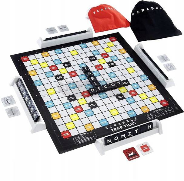 W tej nowej wersji klasycznej gry słownej Scrabble® Pułapki możesz zastawiać pułapki, aby sabotować przeciwników. Gra zyskała niezwykle nieprzewidywalny i emocjonujący charakter dzięki płytkom pułapek i płytkom aktywującym, które włączają do gry specjalne możliwości, takie jak kradzież punktów lub usuwanie płytek, co daje sprytnym graczom niemałą przewagę. Układaj słowa i zbieraj punkty, ale strzeż się pól premiowych! Może się na nich czaić pułapka, która zmieni bieg gry. Skup się dobrze w każdej rundzie, bo gra zmienia się wraz z każdą aktywowaną pułapką.