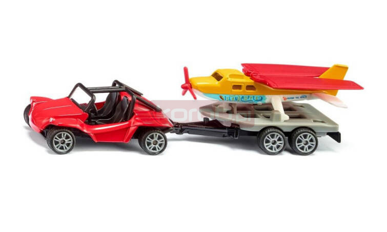 Zanim pilot hobbystyczny będzie mógł wystartować i cieszyć się wolnością ponad chmurami, musi najpierw doprowadzić swój samolot do odpowiedniego punktu startowego. Połączenie sportowego samochodu i przyczepy do samolotów sportowych to idealne połączenie w drodze na lotnisko. Czerwony samochód ma metalową karoserię z pałąkiem i gumowe opony ze sportowymi felgami. Dołączona srebrna zawieszka to oś tandemowa ze specjalnym mocowaniem do samolotów sportowych. Czerwone plastikowe skrzydła dołączonego samolotu można złożyć na czas transportu. Nadruk na metalowym kadłubie jest różny z obu stron, żółta plastikowa górna część sprawia, że samolot błyszczy kolorowo.