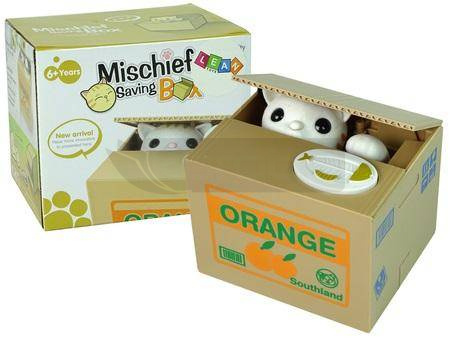 Skarbonka Kot Nauka Oszczędzania Pomarańcza Każde dziecko uwielbia zbierać swoje oszczędności. Skarbonka Kot jeszcze bardziej zachęci Twoje dziecko do odkładania pieniążków. Naciśnij przycisk na budce a kot dźwignie pokrywkę i łapką wciągnie pieniążka. Wymiary budki: - długość - 12 cm - wysokość - 9 cm - szerokość - 10 cm Zabawka zapakowana w pudełko idealnie nadaje się na prezent. Pieniądze ze skarbonki można łatwo od dołu wyjąć.