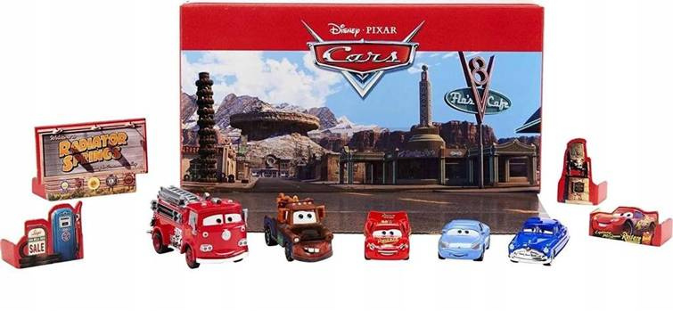 Fani filmu Disney Pixar Cars pokochają ten pierwszy inspirowany filmami zestaw z pięcioma zestawami i zawsze wymyślają nowe historie! Po otwarciu opakowania rozkładana scena pochodzi z kawiarni Flo w Radiator Springs, wycinany plakat filmowy i perforowane akcesoria, takie jak dystrybutor paliwa i znak powitalny. 5 dołączonych pojazdów postaci może być używanych do zabawy. Zestaw składa się z Lightning McQueen, Hook, Sally, Doc Hudson i Fire Engine Red! Fani samochodów będą mieli mnóstwo zabawy, odtwarzając ulubione sceny z filmów i wymyślając nowe historie! Natychmiastowa zabawa w kolekcjonowanie z ulubionymi pojazdami fanów, świetny prezent dla kolekcjonerów i dzieci w wieku od 3 lat.