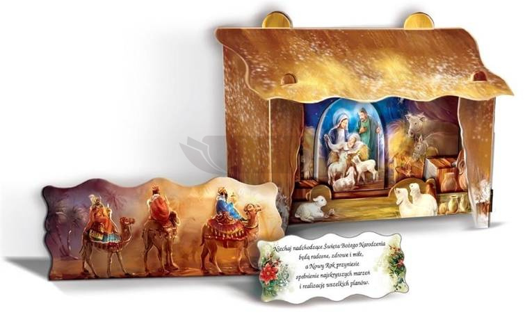 Przestrzenna szopka bożonarodzeniowa o wymiarach 6 x 22 x 15 cm. Doskonale wkomponuje się w dekoracje świąteczne każdego domu. Przedstawia Świętą Rodzinę w czasie narodzin Pana Jezusa oraz przybycie Trzech Króli. Gotowa do złożenia bez użycia kleju.