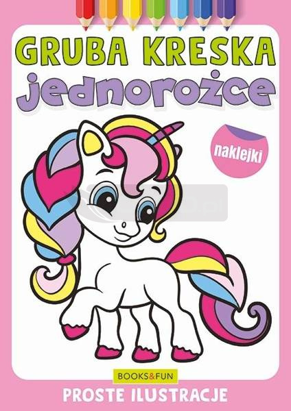 GRUBA KRESKA to kolekcja kolorowanek z prostymi rysunkami skierowana głównie do najmłodszych dzieci. Gruby obrys ułatwi kolorowanie i zapewni świetną zabawę. Nasza seria została przygotowana tak, aby ułatwić dzieciom ćwiczenie ręki. W środku czeka na nie niespodzianka naklejki, które podpowiedzą maluchom, jakich mogą używać kolorów.