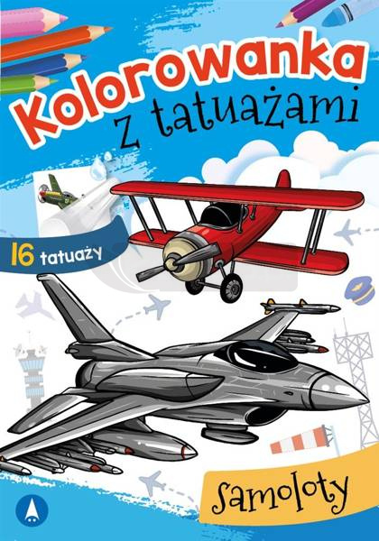 W środku: projekty do kolorowania i zestaw zmywalnych tatuaży (wzory kolorystyczne).