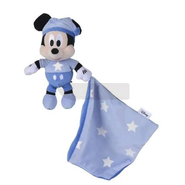 Maskotka przedstawiająca najbardziej znanego bohatera Disneya - Myszkę Miki z kocykiem, z gwiazdkami na ubranku świecącymi w ciemnościach.