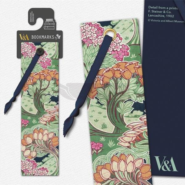 Skórzana zakładka do książki ze wstążką. Piękny wzór z muzeum Wiktorii i Alberta.