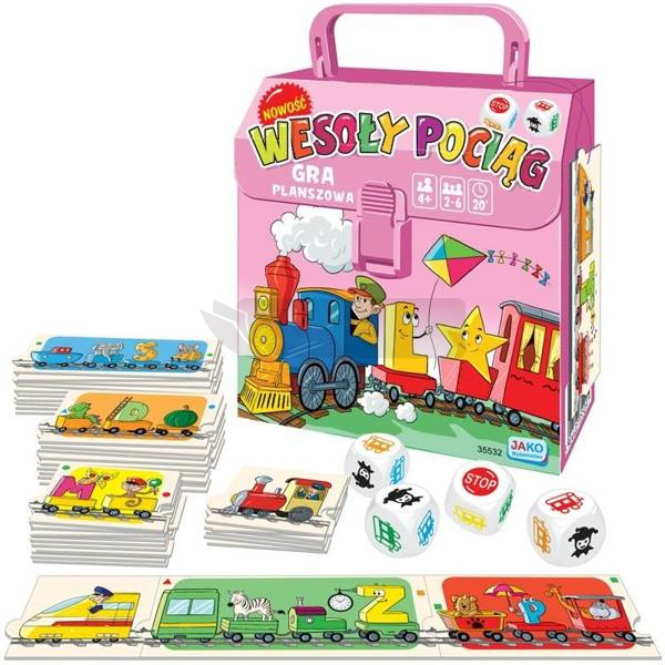 Gra planszowa Wesoły pociąg dzięki prostym zasadom jest odpowiednia dla przedszkolaka, wciągnie także dorosłego gracza. To gwarancja udanej zabawy dla wszystkich, bez względu na wiek. Wybierzcie swoje lokomotywy, parowe ciuchcie lub szybkie elektrowozy. Rzucając kostkami, zdobywajcie wesołe wagoniki i budujcie swoje pociągi. Gracz, który będzie mieć najwięcej wagonów (punktów), wygrywa. W wariancie zaawansowanym wykażcie się znajomością alfabetu i zdobywajcie dodatkowe punkty. Zasady gry Wesoły pociąg: Elementy gry - 30 kartoników z wagonami (2-, 3- i 4-wagonowymi) - 6 kartoników z lokomotywami - 3 kostki z wagonami i dżokerem - 1 kostka z wagonami i stopem Cel gry Zadaniem graczy jest zbudowanie pociągów z jak największą liczbą wagonów (uzyskanie jak największej liczby punktów). Przygotowanie do gry - Rozłóżcie kartoniki z wagonami, pogrupujcie je według kolorów i długości (tworząc pulę). - Kostki połóżcie obok nich. - Każdy gracz bierze po 1 kartoniku z lokomotywą i kładzie go przed sobą. Jeśli graczy jest mniej niż sześciu, niewykorzystane kartoniki z lokomotywami nie biorą udziału w grze. Rozgrywka Grę rozpoczyna osoba, która ostatnio jechała pociągiem (lub najmłodszy gracz). - Gracz w swojej kolejce bierze kostki i rzuca wszystkimi naraz. Może wykonać maksymalnie 3 takie rzuty. Po każdym rzucie może odłożyć na bok wybrane kostki. Pozostałymi rzuca dalej. Raz odłożone kostki może wykorzystać w kolejnych rzutach. - Celem rzutów jest uzyskanie odpowiedniej wartości na kostkach, zabranie z puli zgodnego co do koloru i liczby wagonów kartonika i dodanie go do swojego pociągu. - Jeśli gracz wyrzuci Stop - nie zdobywa żadnego kartonika - grę kontynuuje kolejna osoba. - Dżoker zastępuje dowolny kolor. - Jeśli wyrzucona wartość nie jest dostępna, gracz może zabrać kartonik w danym kolorze o mniejszej liczbie wagonów. - Jeśli w puli nie będzie już kartoników odpowiadających wartości na kostkach, to gracz nie zdobywa żadnego kartonika - grę kontynuuje kolejna osoba. - Podczas jednej kolejki można zdobyć tylko jeden kartonik (jeśli są dwie pary, gracz wybiera jedną z nich). - Kolejka przebiega zgodnie z kierunkiem ruchu wskazówek zegara. Koniec gry Gra się kończy, gdy w puli nie ma już kartoników. Policzcie wagony w swoich pociągach. Każdy wagon to jeden zdobyty punkt. Wygrywa gracz, który zdobędzie najwięcej punktów. Możliwy jest remis. Wariant zaawansowany Punkty ekstra Jeśli chcecie zwiększyć poziom trudności gry, wprowadźcie dodatkową zasadę: za każde połączenie kartoników, w których literki ułożone są zgodnie z kolejnością, w jakiej występują w alfabecie, zdobywacie dodatkowe punkty. Praktyczne opakowanie w formie kuferka zachęci dziecko do posprzątania po skończonej zabawie. Bawcie się i doskonalcie różne umiejętności: - logiczne myślenie - liczenie - znajomość alfabetu - rozpoznawanie kolorów - zdolności manualne - kreatywność i wyobraźnię - spostrzegawczość i koncentrację