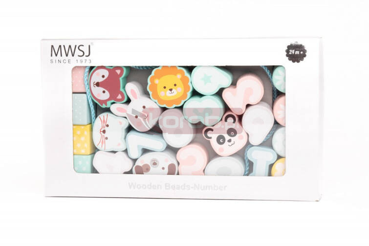 Drewniane figurki-koraliki pomalowane bezpiecznymi farbami wodnymi. Każda ma dziurkę, w zestawie znajduje się sznurek na który można je nawlekać. Zabawka uczy ruchów precyzyjnych, rozwija wyobraźnię, figurki doskonale nadają się do każdej zabawy i pomagają dziecku opowiadać historie. Klocki mają łagodne pastelowe kolory odpowiednie dla wrażliwych zmysłów dziecka od 24M życia.