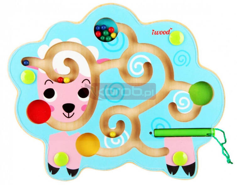Drewniany labirynt w formie owieczki sprawi, że dziecko nie będzie potrafiło oderwać się do tej niezwykle uroczej zabawki. Innowacyjny sposób na naukę kształtów i ćwiczenia ruchów precyzyjnych u dziecka. Za pomocą rysika magnetycznego zawartego w zestawie maluch może próbować przesuwać kuleczki, które znajdują się za przezroczystą szybką i starać się przenosić je do odpowiednich otworów.