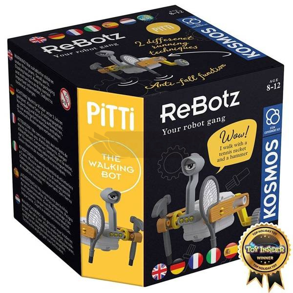 Szybciej! Ten mały robot firmy KOSMOS jest po prostu nie do powstrzymania. Wystarczy kilka kliknięć, aby skonfigurować zabawnego ReBota. Baterie szybko się wkładają, a w pokoju dziecięcym panuje imprezowy nastrój. Po prostu złóż dwa koła, rakietę tenisową, młotek i silnik zgodnie z instrukcjami. Pitti przywiózł je wszystkie ze złomowiska, skąd pochodzi również trzech jego kumpli z gangu robotów - ich części ciała są pokryte fajnymi, tandetnymi naklejkami. Co się stanie, gdy kończyny różnych robotów zostaną pomieszane? Niespodzianka! Zabawny prezent firmy KOSMOS dla dzieci od 8 roku życia. Zawartość: