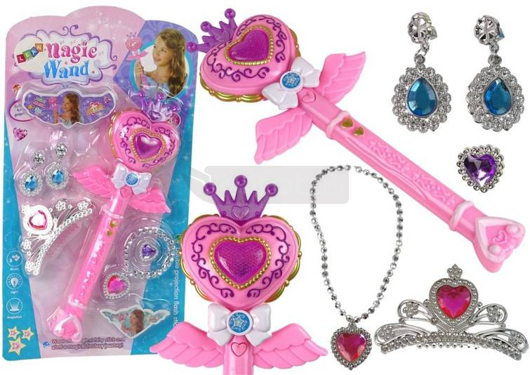 Magiczny Zestaw Księżniczek z Bajki Interaktywna Różdżka ze Światłem i Dźwiękiem Funkcja Projektora Gwiazd ! + Akcesoria Dla Małej Damy Przepiękny zestaw małej księżniczki - wróżki, z magiczną różdżką i biżuterią, to idealny prezent dla dziewczynki powyżej 3-go roku życia. Różowa różdżka z sercem i koroną wyczaruje długie godziny niezapomnianej zabawy, dzięki interaktywnym funkcjom. Różdżka posiada funkcję projektora, który zamieni pokój w magiczne niebo pełne gwiazd, migoczące światełka i bajkowe melodie włączają się po naciśnięciu przycisku z przodu. W magicznym zestawie znalazły się również kolczyki, korona, pierścionek oraz naszyjnik z różnokolorowych kamieni. Całość utrzymana jest bajkowych odcieniach. Wymiary różdżki: 33 cm x 13 cm Idealny pomysł na prezent dla małej księżniczki ! Produkt przeznaczony dla dzieci powyżej 3 roku życia. Zabawka posiada certyfikat CE oraz wszystkie niezbędne certyfikaty w tym EN71. Zabawka zasilana bateriami 3 x AA 1.5 V (brak w zestawie)