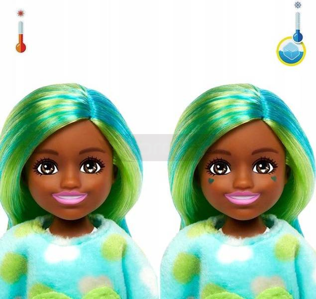 Cutie Reveal to seria lalek w przebraniach słodkich zwierzaków Rozpakowywanie lalek Barbie® Cutie Reveal™ to świetna zabawa dzięki niespodziankom, w tym lalce Chelsea ! W opakowaniu znajdziesz mięciutkiego słonika i torebki-niespodzianki. Gdy zdejmiesz z lalki kostium słonika, odkryjesz pod nim lalkę Chelsea® z długimi włosami oraz lśniącymi detalami. Otwórz torebki-niespodzianki, aby znaleźć ubranko, akcesoria, gąbkę-grzebień i malutkiego słonia. Dzieci mogą przebierać lalkę Barbie® i dobierać akcesoria – góra kostiumu po odwróceniu staje się kurtką z niezwykle miękkiego polaru, a głowa kostiumu legowiskiem dla zwierzątka! Ale to jeszcze nie koniec niespodzianek! Czas na transformację ze zmianą koloru. Na twarzy Barbie® pojawia się makijaż inspirowany zwierzątkiem, a jej uroczy słonik „otwiera i zamyka” oczy. Aby aktywować zmianę koloru, wystarczy użyć zimnej wody i gąbki-grzebienia. Użyj ciepłej wody, aby wrócić do pierwotnego wyglądu. W serii Barbie® Cutie Reveal™ magicznym zachwytom nie ma końca!