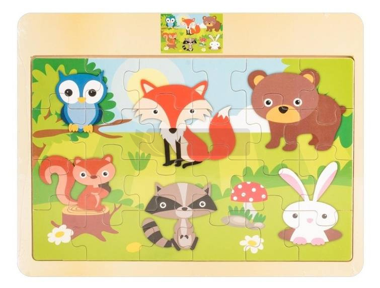 Układanka drewniana na dzieci, rozwija spostrzegawczość, wyobraźnię i koordynację wzrokowo-ruchową. Puzzle składają się z 24 elementów z poglądowym obrazkiem. Produkt przeznaczony dla dzieci powyżej 18 miesiąca życia, posiada certyfikat CE