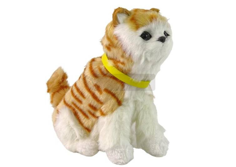 Interaktywny Pluszowy Kotek Mięciutkie Futerko Pogłaszcz go po głowie i poznaj jego funkcje ! Jeśli Twoje dziecko marzy o własnym kotku - opiece nad nim, głaskaniu, przytulaniu zwierzątka i chce mieć swojego przyjaciela to interaktywny kotek to świetny kompan zabaw! Pomożemy spełnić to marzenie. Uruchamia się po pogłaskaniu głowy: zaczyna miauczeć, poruszać główką i ogonkiem. Z każdym kontaktem kotek będzie reagował. Twój maluch poczuje, jakby miał prawdziwe zwierzątko. Zabawka nie tylko wywoła uśmiech na jego twarzy, ale i wesoło spędzi wolny czas. Będzie to początek do posiadania własnego zwierzęcia i nauki odpowiedzialności za zwierzę poprzez zabawę oraz sumienności w wykonywaniu obowiązków. Zaprocentuje to w przyszłości. A kto wie, może dzięki temu, jak maluch będzie opiekował się małym kotkiem, zasłuży na prawdziwego. Futerko kotka w kolorze biało-rudym w brązowe paski jest niezwykle miękkie i przyjemne w dotyku. Kolor oczu ciemny z otoczką zielonego . Żółta, zdejmowana obroża na szyi dodaje mu uroku. Wymiary kotka: 19 cm x 17 cm x 13 cm Wymiary opakowania: 20 cm x 18 cm x 13 cm Zabawkowy kotek zapakowany jest w przezroczystą folię. Przeznaczony jest dla wszystkich dzieci, które ukończyły 3. rok życia. Piesek posiada certyfikat CE, co jest potwierdzeniem, że spełnia wymagania dyrektyw Unii Europejskiej. Zgodny z normą EN71. Jest to bardzo bezpieczna zabawka, pozbawiona ostrych elementów, przyjemna w dotyku. Do zabawy z kotkiem potrzebujecie 3 sztuk baterii 1,5V "AA". Wejście na baterie znajduje się pod spodem, pod futerkiem.