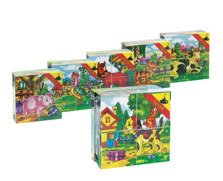 W zestawie znajdują się 4 kostki w kształcie sześcianów. Na każdej ściance klocka naklejony jest inny fragment układanki. Dziecko układając klocki ćwiczy zdolności manualne, pamięć oraz wyobraźnię.
