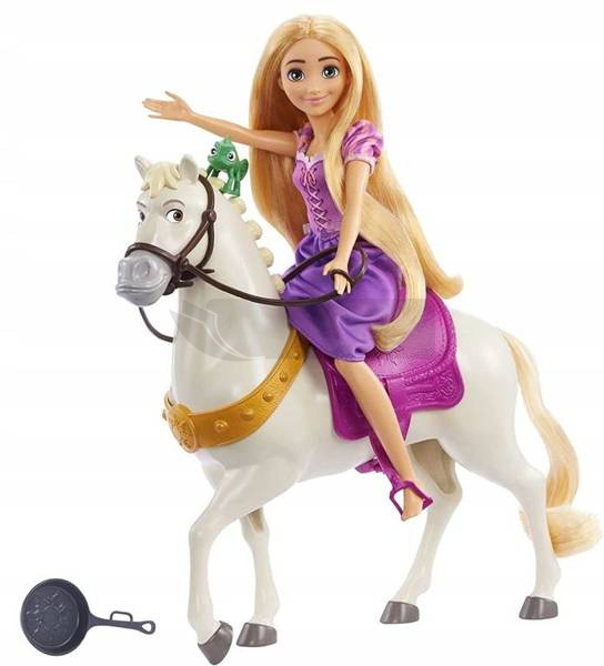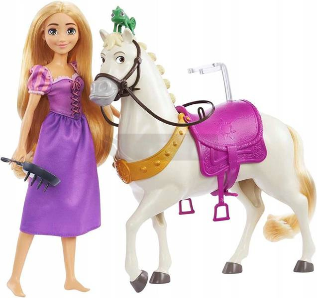 Poznaj serię niepowtarzalnych lalek Disney Princess. Inspirowani animowanymi bohaterami filmu „Zaplątani” Disneya lalka Roszpunka i konik Maksimus są doskonałym prezentem dla każdego fana filmu. Maksimus ma siodło i uzdę, dzięki czemu jest zawsze gotowy do jazdy. Dzięki zginanym kolanom Roszpunka może łatwiej dosiadać konia. Jest ubrana w miękką sukienkę w swoim popisowym kolorze fioletu. Roszpunka ma długie włosy i szczotkę w kształcie patelni do zabawy w czesanie i stylizację fryzur. W zestawie jest też urocza figurka Pascala, którą można przyczepić do ramienia Roszpunki lub grzywy Maksimusa. Doskonały prezent dla dzieci, które mogą odtwarzać swoje ulubione momenty z filmu lub wymyślać własne opowieści z Roszpunką i jej przyjaciółmi. Fani mogą zebrać też inne zabawki inspirowane Roszpunką, takie jak Wieża Roszpunki, aby przezywać jeszcze więcej przygód w magicznym królestwie.