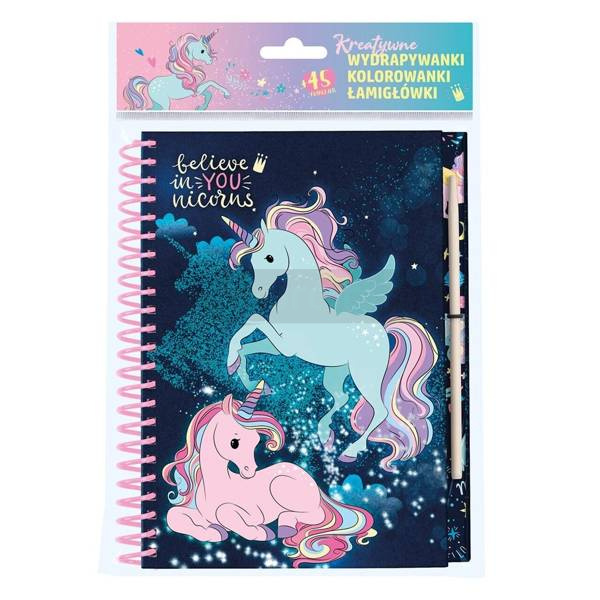 Notes kreatywny na spirali o formacie 20 x 14 cm z metalizowaną okładką. Zestaw zawiera 45 metalizowanych naklejek, 4 wydrapywanki, 20 kolorowanek, 20 łamigłówek, 35 kartek notesu oraz bambusowy rylec.