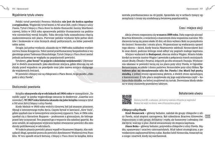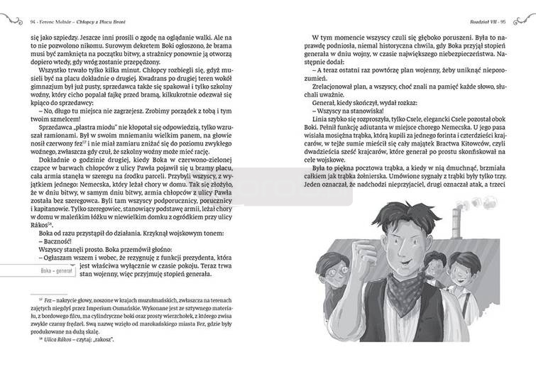 Chłopcy z Placu Broni to książka czytana z zapałem przez wiele pokoleń uczniów. To wyjątkowa opowieść o przyjaźni, poświęceniu w imię idei i niezwykłym przywiązaniu do pewnego niezagospodarowanego budapeszteńskiego placu. Grupa chłopców, szkolnych przyjaciół, spotykała się regularnie w ulubionym miejscu. Mieli przywódcę, Bokę, stopnie wojskowe i prawdziwie żołnierski kodeks moralny. Wśród nich był Nemecsek - niepozorny szeregowiec, drobny i nieśmiały, w którym drzemał ogromny potencjał. Spokój chłopaków z ulicy Pawła zmąciły Czerwone Koszule, grupa chłopców z Ogrodu Botanicznego. Wrogowie, pod wodzą Feriego tsa, postanowili zdobyć plac - wybuchła wojna... Kto okazał się prawdziwym bohaterem? Kto wygrał?