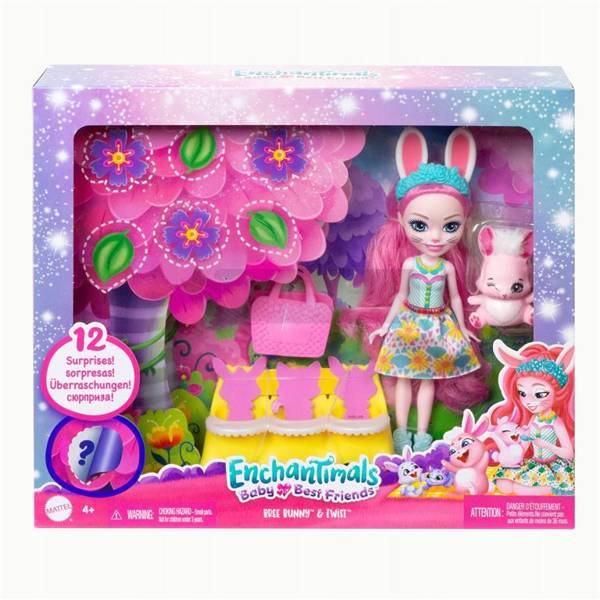 Daj się zaczarować tym słodkim dziewczynkom i ich zwierzątkom! Enchantimals™ to grupa uroczych dziewczynek związanych ze swoimi ukochanymi zwierzątkami wyjątkową więzią – nie tylko nie odstępują od siebie na krok, lecz także wyglądają podobnie! Zaskocz swojego małego miłośnika zwierząt Enchantimals. Te lalki ożywiają uroczą grupę przyjaciół w towarzystwie swoich nierozłącznych zwierzaków, którymi się opiekują i rozpieszczają, ponieważ są ich najlepszymi przyjaciółmi. Każda zabawka Enchantimals Baby Best Friends jest dostarczana w pudełku pełnym tajemniczych niespodzianek — w każdym pudełku jest ich 12! Chłopcy i dziewczynki odkryją lalkę w zdejmowanej spódniczce i butach, a także dużą figurkę najlepszego przyjaciela zwierzątka. Później, kiedy usuną kwiaty i liście, zobaczą, że jest jeszcze więcej niespodzianek: 3 najlepszych przyjaciółek i 9 akcesoriów dla niemowląt. Akcesoria pasują do wszystkich figurek Enchantimals Baby Best Friends i można je ze sobą mieszać i dopasowywać, aby dołączyć większy element, taki jak bujany fotel lub huśtawka. Każdy z zestawów zawiera również 1 nosidełko i 1 torbę na pieluchy, dzięki czemu możesz wymyślać niezliczone historie.