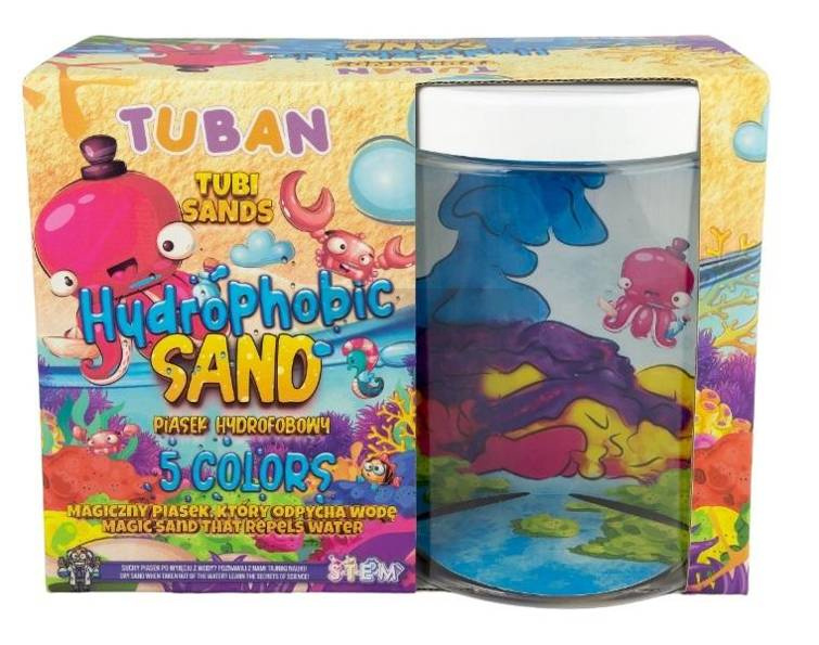 Odkryj niezwykły piasek, który nie moknie! Zabawa PIASKIEM HYDROFOBOWYM to coś dla wszystkich entuzjastach eksperymentów i kreatywnej zabawy. Jego najbardziej fascynującą cechą jest zdolność odpychania wody. Kolory piasku można dowolnie łączyć i wrzucać do wypełnionego wodą akwarium z zestawu. Co ciekawe, piasek po wrzuceniu do wody, wciąż jest dalej suchy. Można go wyciągać i ponownie zanurzać, podziwiając przy tym ciekawe kształty, które tworzy. Zabawa ta może przybliżyć dzieciom wiedzę o właściwościach fizycznych substancji. Zestaw zawiera 5 saszetek piasków w kolorach: żółtym, pomarańczowym, czerwonym, niebieskim i fioletowym oraz akwarium do wypełnienia wodą.