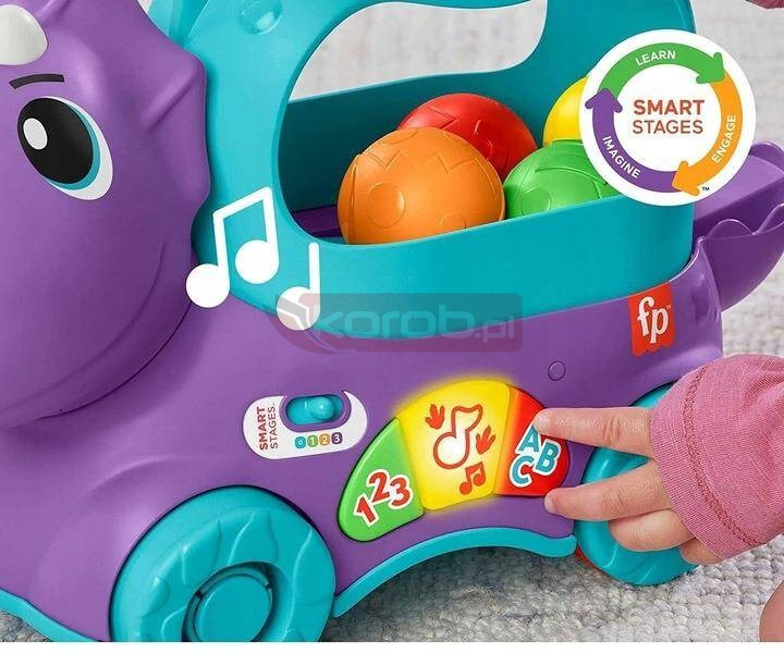 Interaktywna zabawka do ciągnięcia z kulką dinozaura ze światłami i ponad 40 piosenkami, dźwiękami i wypowiedziami Mali miłośnicy dinozaurów mogą pchać lub ciągnąć triceratopsa, aby bawić się wybijaniem piłek, a także aktywowanymi ruchem światłami i dźwiękami 3 poziomy nauki Smart Stages uczą alfabetu, liczenia, kolorów i kształtów Zawiera 4 kolorowe kulki z „jajami dino”, które dzieci mogą chwycić i wrzucić na plecy dinozaura Pomaga wzmocnić małą i dużą motorykę niemowląt i małych dzieci w wieku 12-36 miesięcy