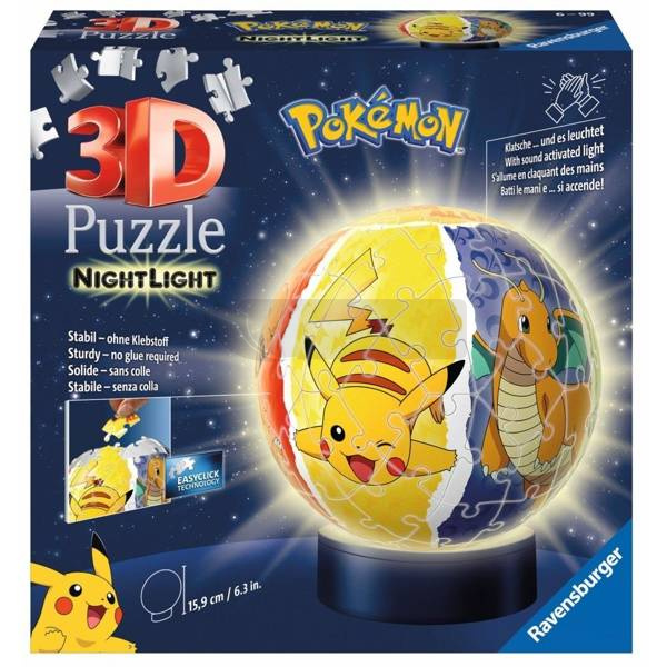 Świecąca kula 3D Pokemon to coś dla miłośników bohaterów tej znanej bajki. Puzzle 3D w tym zestawie po połączeniu tworzą kulę, która na dodatek może służyć za nocną lampkę, dzięki podświetleniu LED. Żeby włączyć lub wyłączyć lampkę wystarczy zaklaskać. Na wewnętrznej stronie każdego puzzla nadrukowany jest numer, dzięki czemu składamy kulę według kolejności elementów.