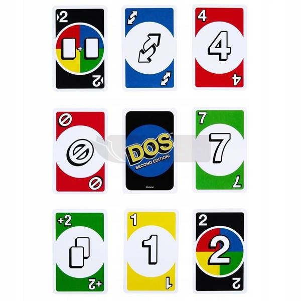Odkryj nową grę karcianą Dos inspirowaną słynną grą Uno. Graj dwiema kartami , dopasowuj kolory, karty i sumuj punkty! Aby odrzucić wszystkie karty, wymagana jest strategia! Na początku gry na stole kładzie się dwie karty. Jeden po drugim gracze muszą dobrać lub wyłożyć kartę. Aby móc pozować, liczba (pomiędzy 1 a 10) musi być identyczna z jedną z dwóch kart na środku. Po umieszczeniu karty zakrywasz ją nową kartą ze stosu dobierania. Jeśli kolor i liczba pasują do siebie, możesz zagrać po raz drugi. Karty z numerem 2 są rodzajem jokera i można je umieścić na dowolnym kolorze. Karty „hashtag” można umieszczać na wszystkich liczbach tego samego koloru. Kto jako pierwszy pozbędzie się wszystkich swoich kart? Szybka i łatwa gra karciana, dostępna dla najmłodszych, aby spędzić chwilę z rodziną. W nowej wersji gry musisz krzyknąć „Dos!”, gdy w ręce zostaną Ci dwie karty. Jeśli tego nie zrobisz i zostaniesz "przyłapany" przez innego zawodnika, musisz wziąć dwie karty. UNO™ od wielu lat cieszy się ogromną popularnością, a teraz przygotuj się na podwójną dawkę zabawy z DOS™!