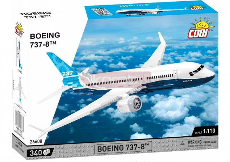 Model nowoczesnego samolotu pasażerskiego Boeing 737-8 został wiernie odwzorowany z 340 klocków konstrukcyjnych COBI. Specjalnie zaprojektowane w skali 1:110 elementy wiernie oddają kształt pierwowzoru. Samolot został wyposażony w obracające się, koła i składane podwozie. Pod charakterystycznymi skrzydłami zamocowane są silniki z obrotowymi wirnikami. Zestaw uzupełnia czarna klockowa podstawka ekspozycyjna, do której można przyczepić dołączoną tabliczkę z nadrukowaną nazwą samolotu! W zestawie zastosowano tylko i wyłącznie trwałe nadruki. Nie ma tutaj żadnych naklejek! Boeing 737-8 od COBI to idealny nabytek dla wszystkich fanów lotnictwa cywilnego, techniki i budowania z klocków konstrukcyjnych. Dzięki wiernie odwzorowanym detalom zachwyci dorosłych kolekcjonerów, młodzież oraz młodych pasjonatów latania!