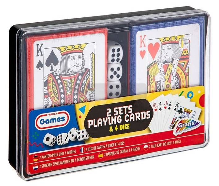 W zestawie znajdują się 2 x zafoliowane talie liczące po 54 karty, 4 x kości do gry.