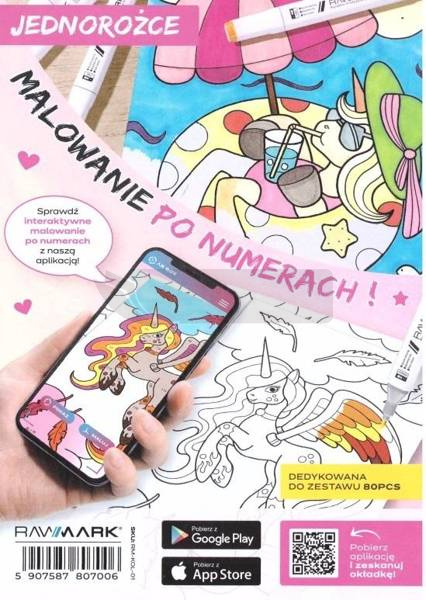 Interaktywna kolorowanka z rozszerzoną rzeczywistością, dociera do młodego pokolenia dzięki aplikacji na telefon, ciągłe powiększanie grupy odbiorców poprzez udostępnianie pokolorowanych prac w mediach społecznościowych, kompatybilna z zestawem markerów alkoholowych RAWMARK Pure Pro i Basic, aplikacja sugeruje dobór kolorów na obrazku.
