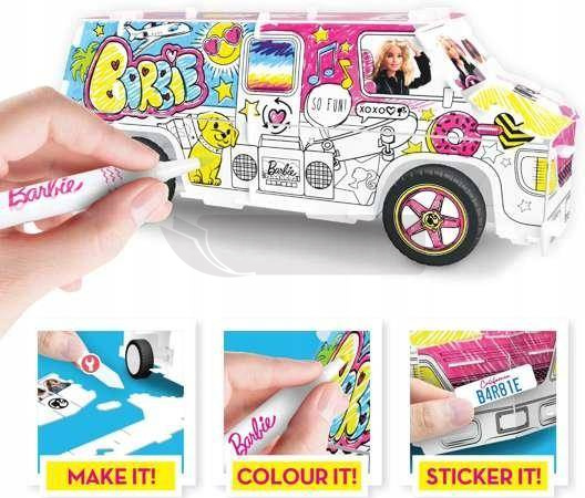 Barbie zestaw kreatywny Pokoloruj swój własny kamper Barbie. Zbuduj wspaniały kamper dla swojej lalki. Zrobisz to bez użycia nożyczek i kleju. Wystarczy wyjąć elementy auta z ramek, połączyć je ze sobą, a następnie zamocować kółka z napędem. Użyj dołączonych flamastrów Barbie, aby pokolorować własnego kampera dla Barbie! Po złożeniu będzie świetnym dodatkiem do każdej kolekcji Barbie! Zestaw zawiera: elementy do złożenia kampera wraz z kołami, 5 markerów arkusz naklejek
