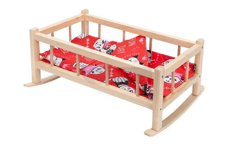 Średniej wielkości kołyska, która dzięki odczepianym płozom może być traktowana jako łóżeczko. Produkt w całości wykonany jest z ekologicznego drewna oraz posiada w zestawie pościel.