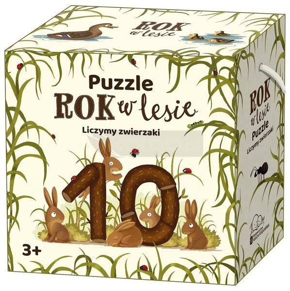 Pudełko zawiera puzzle: 10 elementów z liczbami od 1 do 10 oraz 10 elementów ze zwierzętami: 1 żubrem, 2 niedźwiedziami, 3 sarnami, 4 wydrami, 5 dzikami, 6 zającami, 7 kaczkami, 8 wróblami, 9 dżdżownicami, 10 mrówkami.