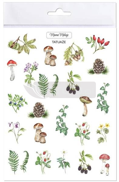 Przepiękne ilustracje ukazujące świat leśnej przyrody mogą znaleźć się na Twoim ciele w postaci zmywalnych tatuaży. Kwiaty, grzyby i rośliny zawarte na arkuszu wyróżnia duży realizm. Uwzględniają one szczegóły i wyjątkowy charakter każdego elementu przyrody.