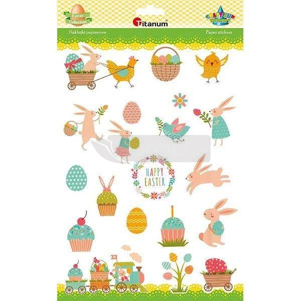Naklejki papierowe: króliczki, pisanki, koszyczki, pociąg, napis "Happy Easter", 20 szt.