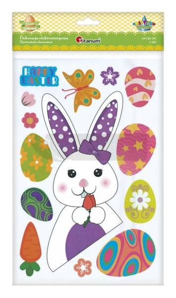 Dekoracje bezklejowe, wielokrotnego użytku - można je zdjąć i przykleić ponownie do gładkich powierzchni takich jak szyby, lustra. Przed montażem powierzchnię, na której będzie dekoracja, należy zrosić wodą z kilkoma kroplami płynu do mycia naczyń, najlepiej za pomocą spryskiwacza, usunąć folię ochronną, ułożyć dekorację na docelowej powierzchni, wycisnąć resztki wody spod dekoracji za pomocą płaskiego narzędzia i osuszyć dekorację papierowym ręcznikiem. Wzory: zając z tulipanem, pisanki, motyl, marchewka, kwiaty, napis 'HAPPY EASTER'. 14 sztuk.