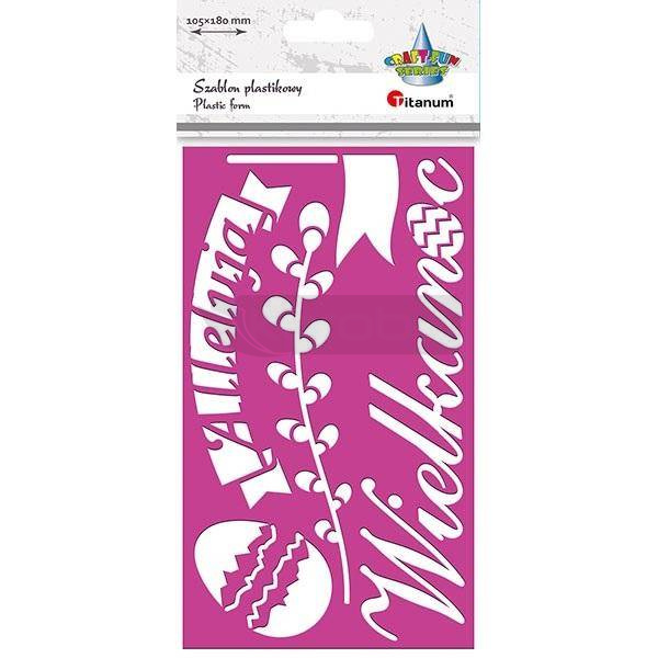 Szablon plastikowy 105 x180 mm: wstęga Alleluja, napis Wielkanoc, proporczyk, bazie, skorupki jajka.