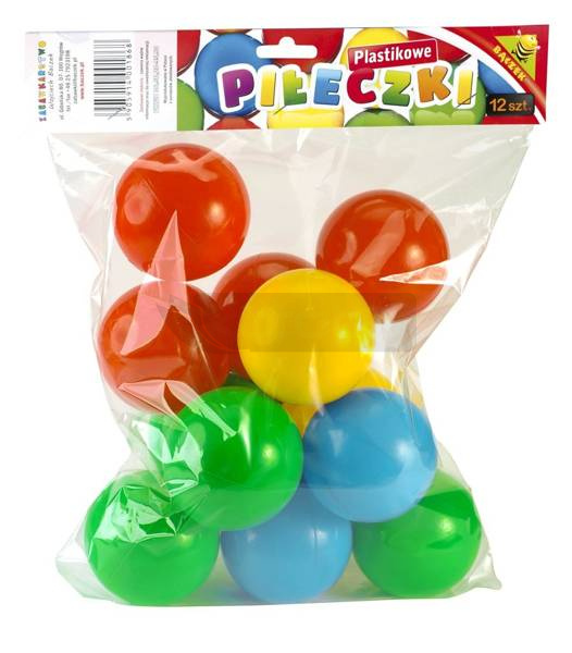 Zestaw 12 sztuk różnokolorowych plastikowych piłeczek. Dzięki uniwersalnemu charakterowi produktu dziecko ma możliwość zabawy zarówno na piasku jak i w wodzie.