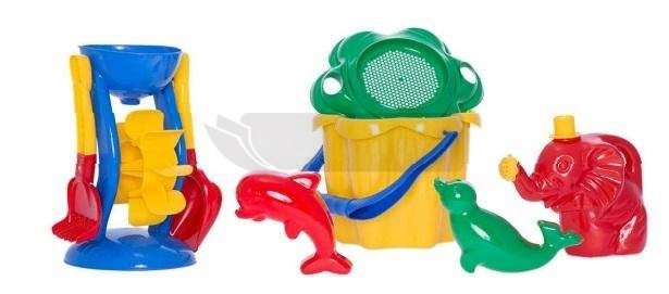 W zestawie znajduje się wiaderko "Kwiatek" z sitkiem, 2 foremki delfinek i foczka, łopatka, grabki, młynek do przesypywania piasku lub przelewania wody oraz konewka "Słoń". Nasz dzieciak na pewno nie będzie się nudził na plaży. A kiedy zabraknie nam mokrego piasku, "Słoń" na pewno nam w tym pomoże.